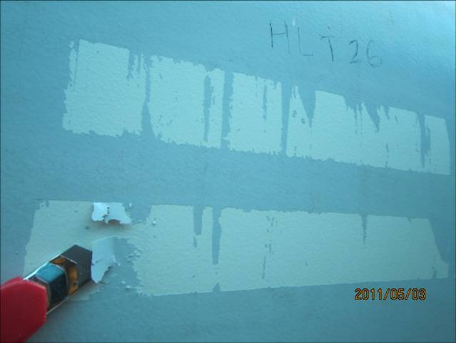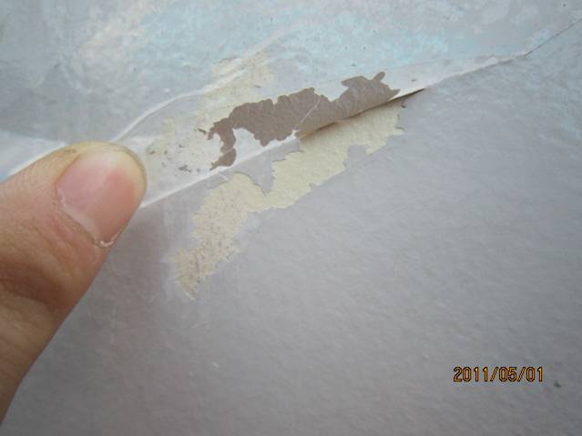 涂层附着力较差,用胶带和刀片很容易去除面漆涂层